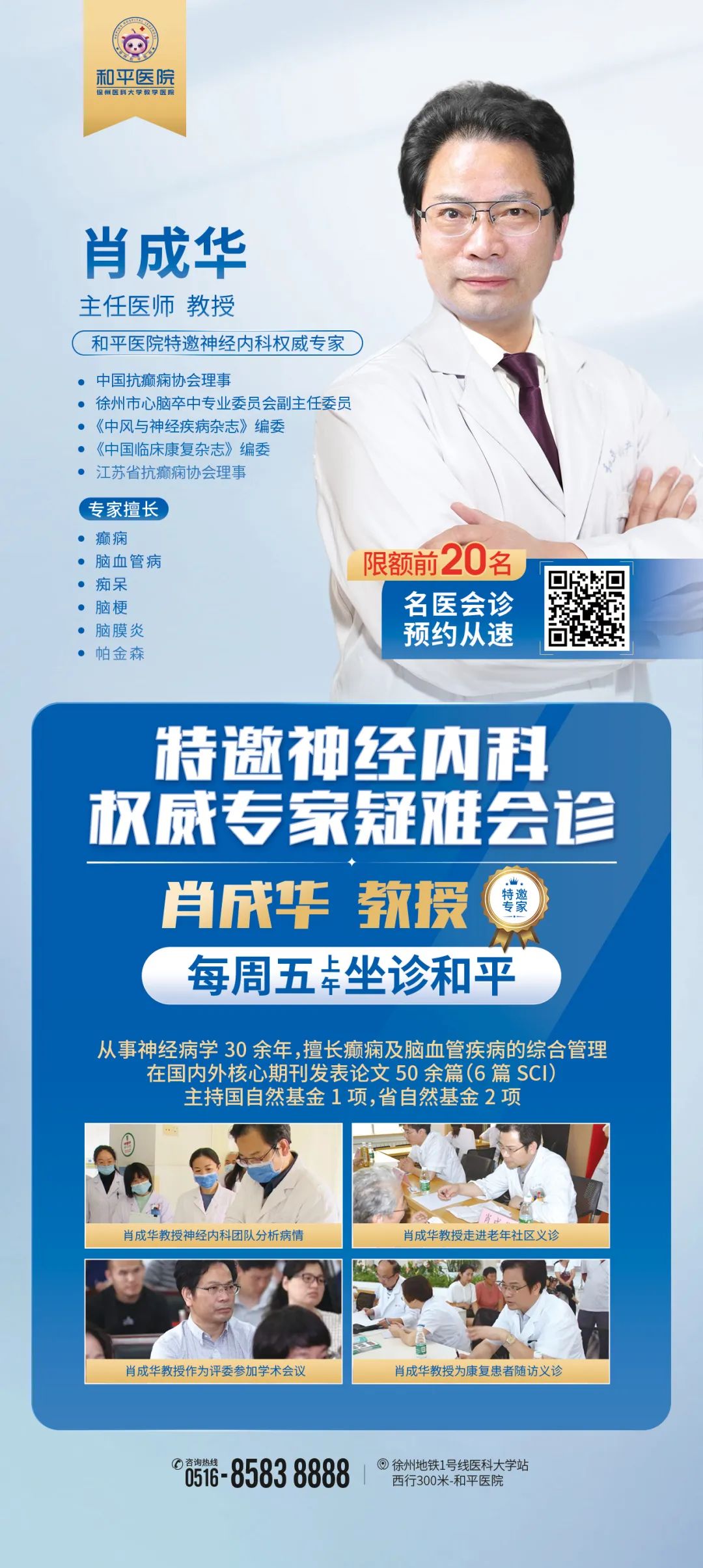 为更好地服务群众,提供更精准、高效的诊疗服务,满足复杂多样的就医需求,我院特邀神经内科权威专家的肖成华教授自2025年1月3号起,每周五上午来院坐诊。