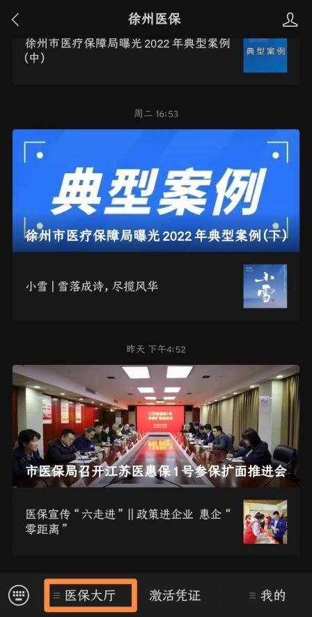 徐州市医保局微信服务号提供了个人中心、举报投诉、线上办理、公共查询等各类医保查询和业务网上办理功能,请您关注“徐州医保”微信公众号,选择左下角“医保大厅”,进入...