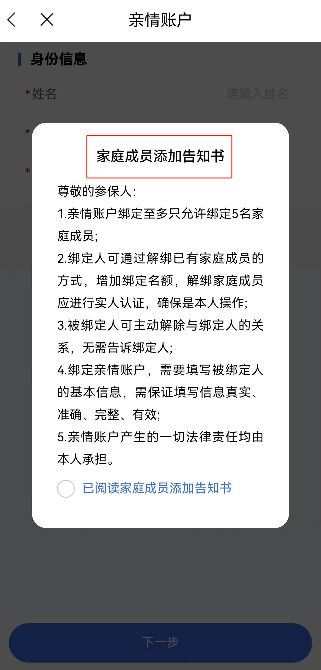 步骤一 下载打开“江苏医保云”APP,注册登录成功后,点击首页“我的”。 步骤二 选择“亲情账户”模块。 步骤三 点击“添加我的家庭成员”。 步骤四 了解“常见问题”,点击“开始绑定”。(特别提醒:如果被绑定人大于16周岁,需要本人扫脸认证后,方可完成绑定。) 步骤五 阅读“家庭成员添加告知书”。 步骤六 根据提示准确填写家庭成员身份信息,点击“下一步”。 步骤七 阅读并签署“承诺书”,点击“确认添加”,即可完成家庭成员亲情账户绑定。 步骤八 如需解绑,进入“亲情账户”模块后,选择“管理家庭成员”。 步骤九 点击“解除绑定”,即可对已添加家庭成员进行解绑。